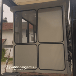 Hier wurde ein kleiner Bürocontainer mit Glasscheiben transportiert. Per Stapler konnte an beiden Verladestellen, Tettenweis (Bayern) und Hattingen (NRW) seitlich verladen werden. Somit konnten wir einen Standard Planen-Sattelzug einsetzen.