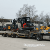 Je nach Größe und Gewicht nutzen wir offene Plateau-LKW, Tieflader oder Tiefbettfahrzeuge. Bei Stahlketten-Baggern wird oft ein Aufpreis fällig, da nicht jeder Ladeflächenuntergrund geeignet ist.