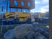 Uff – Das ging ins Gewicht: Die Hebebühne Haulotte HA32PX wiegt etwas mehr als 21 Tonnen bei Abmessungen von LBH 11.95 m x 2.58 m x 2.90 m. Der Transport per Tiefbett ging von Dänemark nach 74429 Sulzbach-Laufen in Baden-Württemberg. Verladen wurde durch Absender und Empfänger.