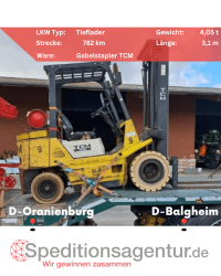 Mit der Hilfe unseres Transportpartners Zumbrink Agrarhandel GmbH, haben wir diesen Transport eines TCM Staplers durchgeführt. Es ging von Oranienburg in Brandenburg nach Balgheim in Baden-Württemberg. Das Ladevolumen belief sich auf 3,1 Lademeter bei etwas über 4 Tonnen Gewicht. Zum Einsatz kam ein Tieflader.