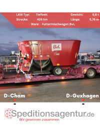 Dank unseres Transportpartners (Link zum Speditionenverzeichnis) konnten wir diesen Futtermischwagen per Tiefbett von Cham in Bayern nach Guxhagen in Hessen transportieren. Das Ladevolum belief sich auf knapp 7 Lademeter bei 6,6 t Gesamtgewicht.