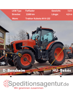 Hier konnten wir mit der Hilfe unseres ungarischen Transportpartners einen Traktor der Marke Kubota, (Modell M 6-132) transportieren. Dabei handelte es sich um ein Vorführmodell mit nur 180 Betriebsstunden, quasi neu! 😉