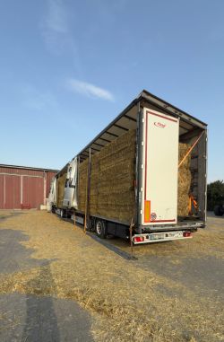Hier wurden ca. 18t Strohballen auf einem Jumbo Hängerzug transportiert und seitlich per Stapler verladen. Es ging von Thüringen nach NRW.