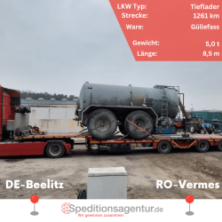 Unser rumänische Transportpartner konnte, auf dem Weg nach Hause, dieses Güllefass in Beelitz (Brandenburg) laden und nach Vermes in Rumänien liefern. Zum Einsatz ein Tieflader.